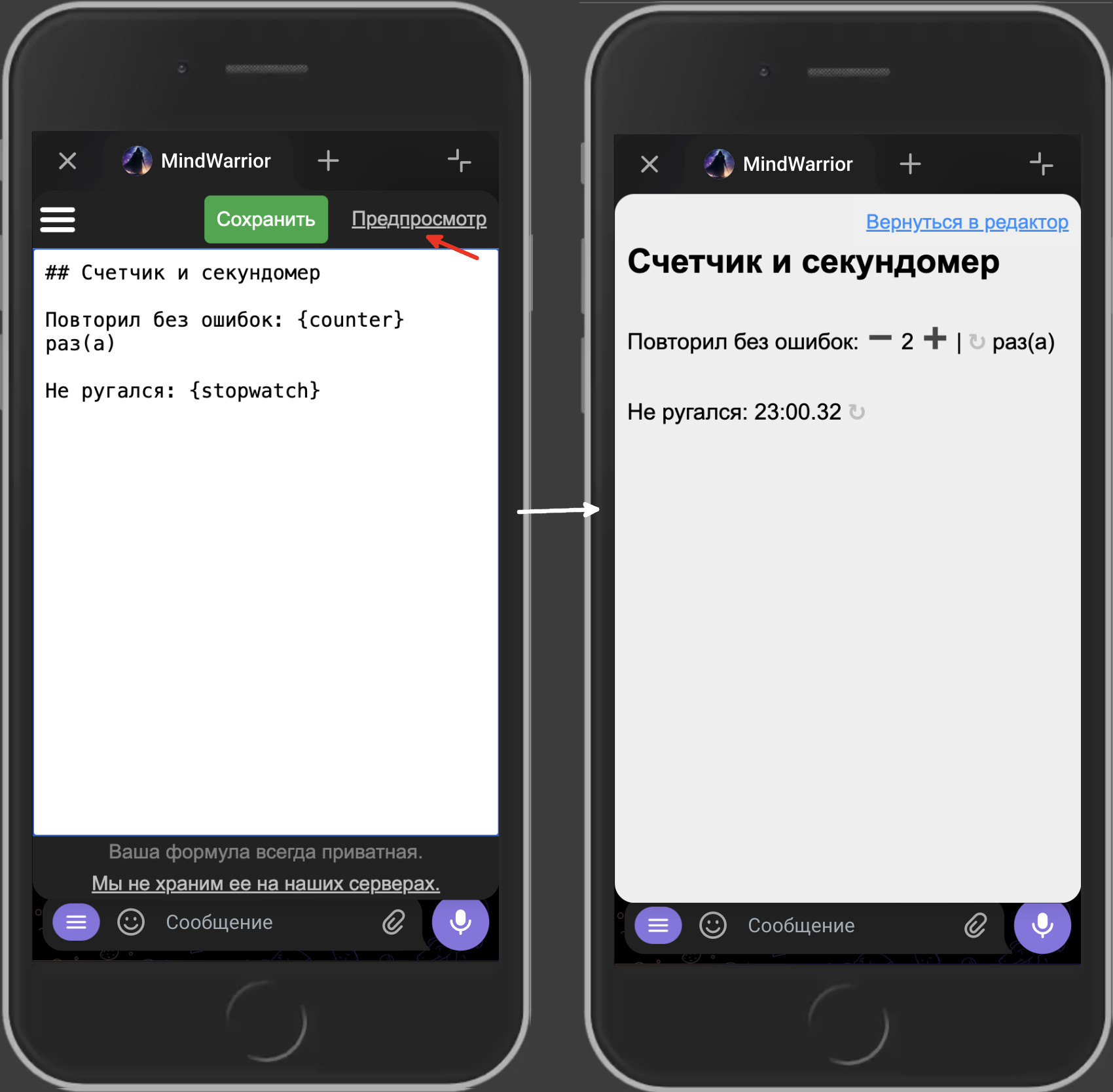 Также можно вставлять в Формулу счетчики и секундомеры, которые помогут вам лучше отслеживать ваш прогресс. Для этого нужно написать {counter} или {stopwatch}.