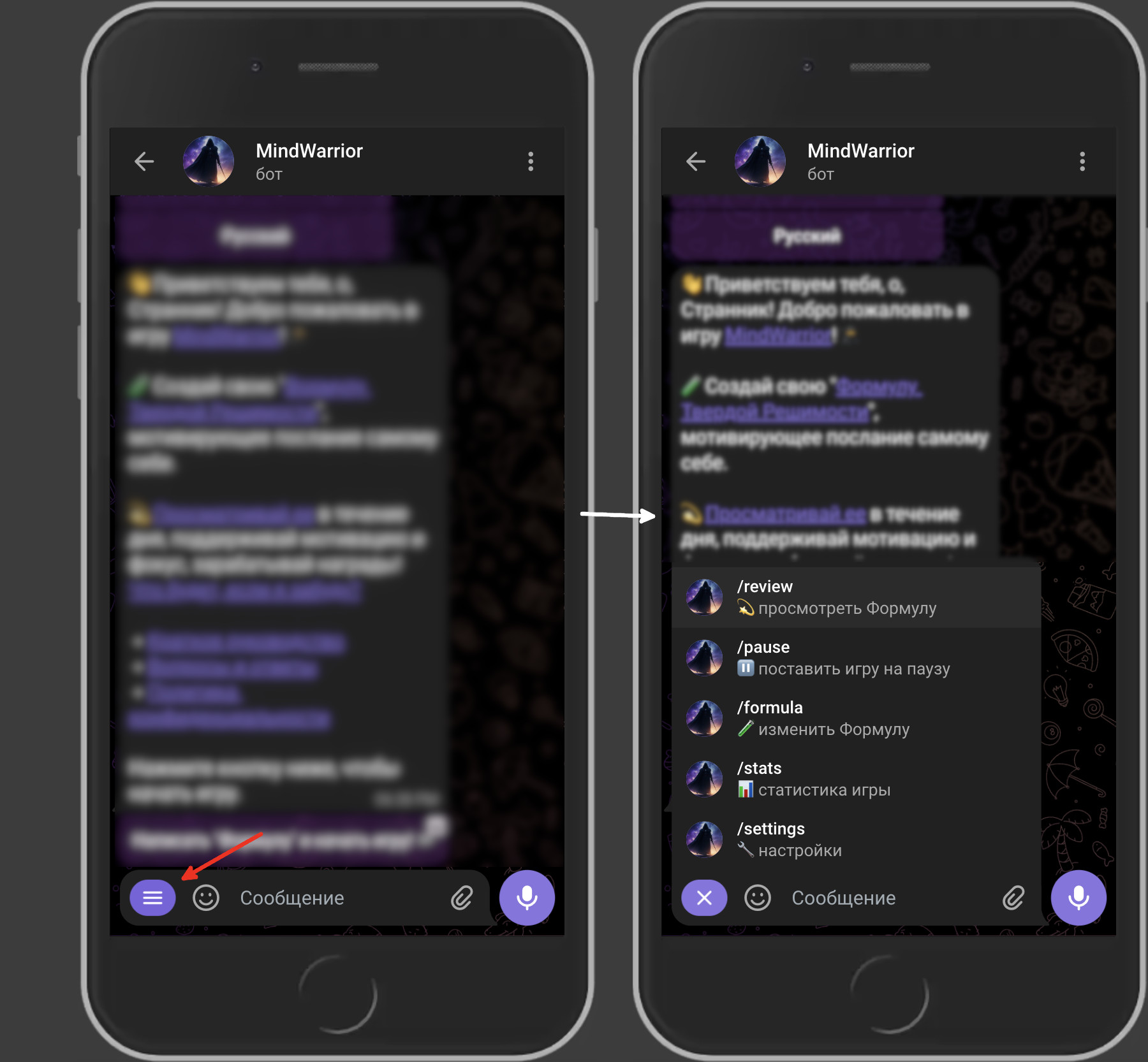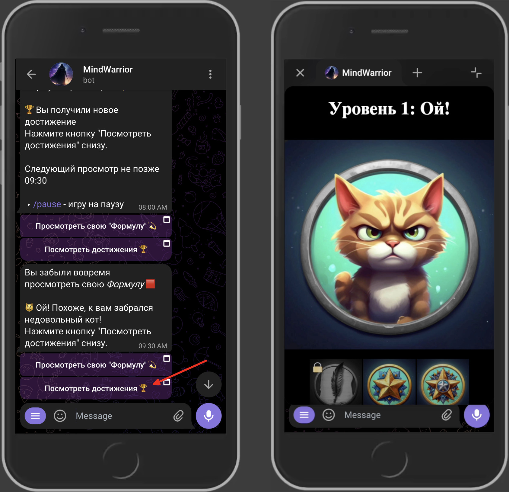 Цель игры "MindWarrior" – поддержать вас на пути вашего личностного развития. Для этого игра попросит вас записать "Формулу твердой решимости" – вдохновляющее приватное послание для себя, которое вы будете регулярно просматривать в течение своего дня.